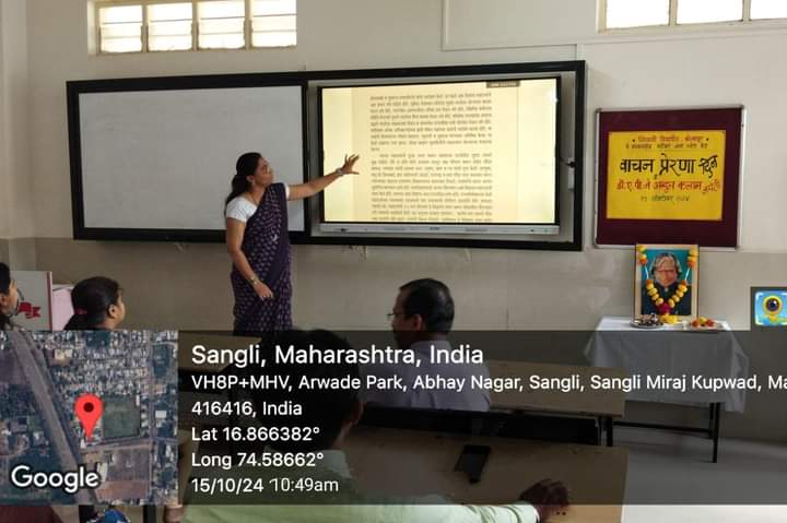 [12:05 pm, 16/10/2024] Mom: १०.४५ या वेळेत डॉ. ए. पी. जे. अब्दुल कलाम यांच्या प्रतिमेचे पूजन महाविद्यालयाचे प्राचार्य डॉ पी के पाटील यांनी केले व सकाळी १०.४५ ते ११.०० या वेळेत प्रत्यक्ष वाचन बी. एड., एम.एड प्रशिक्षणार्थिकडून करवून घेतले सदर कार्यक्रमामध्ये संस्थाचालक, प्राचार्य, शिक्षक, शिक्षकेत्तर सेवक, माजी विद्यार्थी इ. यांचा सहभाग होता. सदर कार्यक्रमांचे सूत्रसंचालन व प्रास्ताविक होनमाने पी. पी व आभार सहा. प्रा डॉ. दिपा बिरनाळे यांनी मानले.