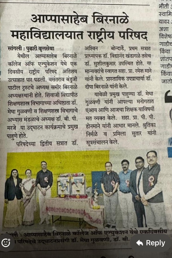 “आप्पासाहेब बिरनाळे कॉलेज ऑफ एज्युकेशन सांगली येथे एकदिवसीय राष्ट्रीय परिषदेचे यशस्वी आयोजन” शनिवार दि. 20 सप्टेंबर 2025 आप्पासाहेब बिरनाळे कॉलेज ऑफ एज्युकेशन सांगली येथे One day National conference अतिशय उत्साहात पार पडली.या कार्यक्रमामध्ये सकाळी 10 वाजलेपासून सायंकाळी 5.00 वाजेपर्यंत उदघाट्न कार्यक्रम, प्रथम सत्र, दुसरे सत्र अशा तीन टप्प्यात सदरची कार्यशाळा नियोजनबद्ध रित्या संपन्न झाली. सुरुवातीला वसंतराव बंडुजी पाटील ट्रस्टचे चेअरमन मा.श्री. समीर बिरनाळे सर यांच्या अध्यक्षतेखाली, शिवाजी विद्यापीठ शिक्षणशास्त्र विभागाच्या अधिष्ठाता डॉ.मेघा गुळवणी मॅडम