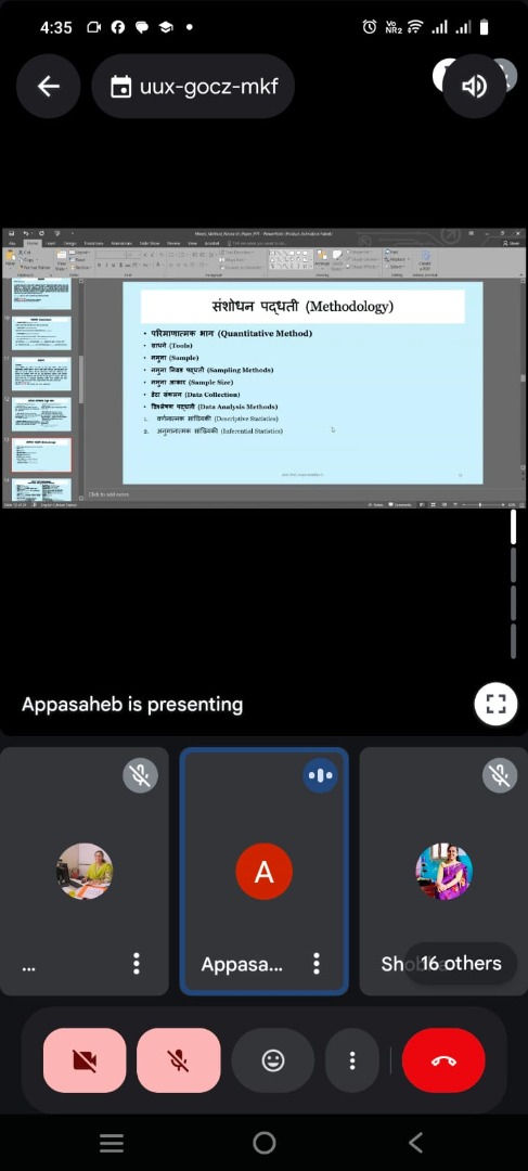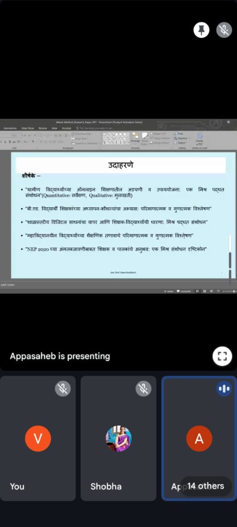 संदर्भ सूची (References)याविषयीं मार्गदर्शन करण्यात आले होते. त्यानंतर शनिवार दि 23/08/2025 रोजी त्या पुढच्या सहा.प्रा.चांदणे एस.व्ही.यांनी Survey Method नुसार Research पेपर कसा लिहावा याची माहिती स्पष्ट केली. पुढील शनिवार दि. 30/08/2025 रोजी सहा.प्रा.होनमाने पी.पी. यांनी “How to write Research Paper in Historical Method ” या विषयावर व्याख्यान दिले.त्यानंतर शनिवार दि. 06/09/2025 रोजी सहा प्रा. पाटोळे व्ही एन यांनी प्रायोगिक संशोधन पद्धती नुसार संशोधन पेपर कसा लिहावा याविषयीं माहिती दिली त्यांनतर आज दि. 13/09/2025 रोजी सहा. प्रा. माने एस जी यांनी यामध्ये मिश्र संशोधन पेपर साठी महत्वाचे मुद्द्यावर दृष्टिक्षेप टाकला. 1) मिश्र संशोधन पेपर चे प्रकार 2) मिश्र संशोधन पेपरचे विस्तृत स्वरूप 3) मिश्र संशोधन पेपर लिहितानाच्या एकूण 10 पायऱ्या तसेच 4) मिश्र संशोधन पेपर लिहिताना प्रस्तावनेत कोणते प्रश्न विचारावेत? याविषयी सर्व इत्यंभूत माहिती सहभागी ना विस्तृत पणे सांगितली. त्याचवेळी मिश्र संशोधन पेपर साठी ज्या पद्धती वापरल्या जातात. त्या प्रत्येक प्रकार /पद्धतीचे उदाहरणासहित प्रभावी स्पष्टीकरण दिले. आजच्या कार्यशाळेमध्ये प्रमुख मार्गदर्शक सहा. प्रा.माने एस.जी. यांचा परिचय सहा. पाटोळे व्ही.एन.यांनी करून दिला. तर कार्यशाळेचे आभार सहा.प्रा. होनमाने पी.पी.यांनी मानले. Workshop Technical Head या नात्याने सहा.प्रा.माने एस.जी.यांनी संपूर्ण कार्यशाळेत PPT Presentation साठी सर्व मार्गदर्शकांना मदत करून आपली जबाबदारी पार पाडली. तसेच सदर workshop यशस्वी होण्यासाठी उप -प्राचार्या डॉ.दीपा बिरनाळे यांचे विशेष मार्गदर्शन मिळाले.सदरची कार्यशाळेची आज 13 सप्टेंबर सांगता झाली. सदरचे नवनवीन उपक्रम घेण्यासाठी संस्था नेहमी पुढाकार घेऊन पाठिंबा देत असतें.त्यामुळेच आपल्या महाविद्यालयातून बाहेर पडणाऱ्या प्रशिक्षणार्थ्यामध्ये संशोधन दृष्टी भिमुखता मध्ये वाढ होत आहे.
