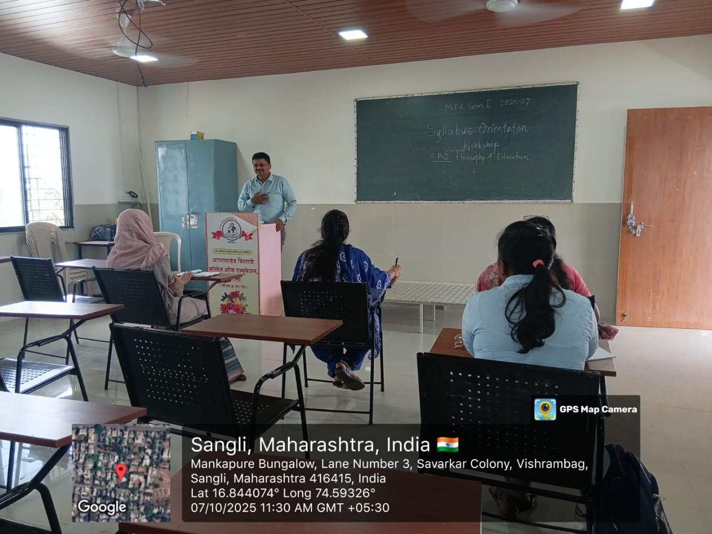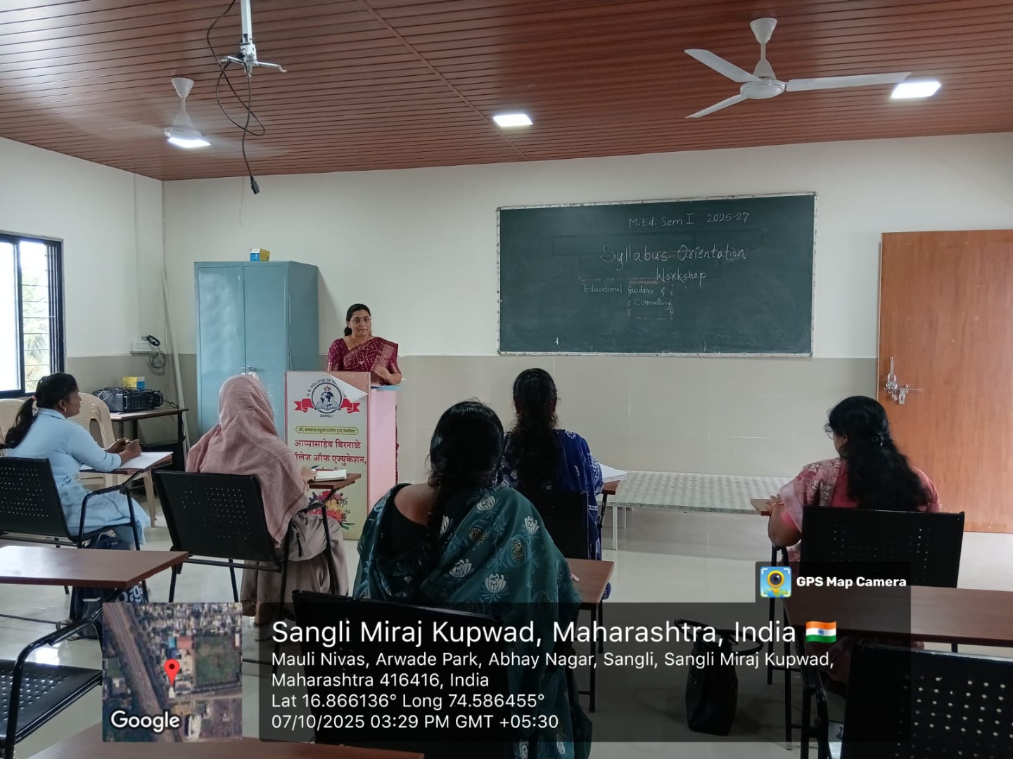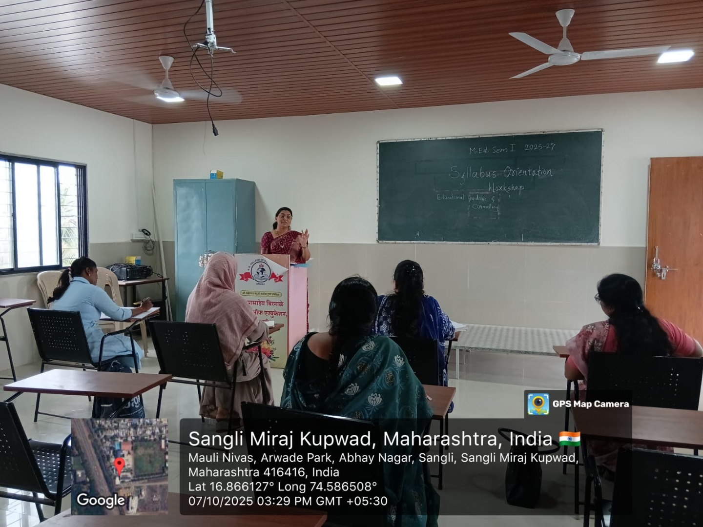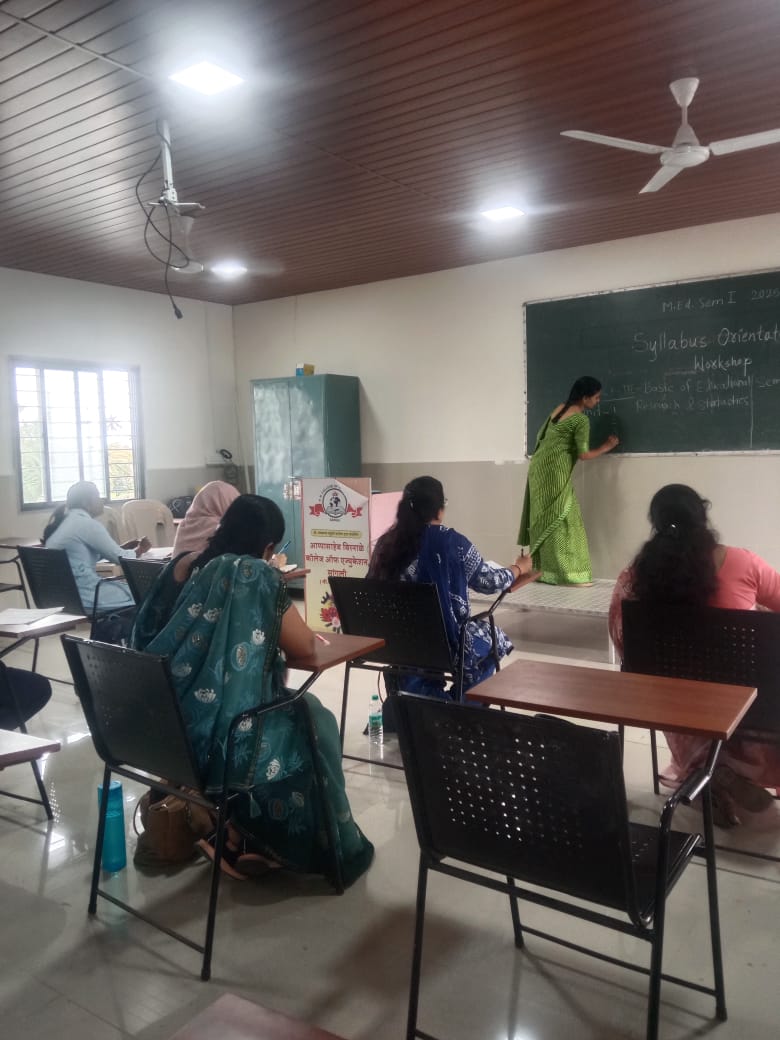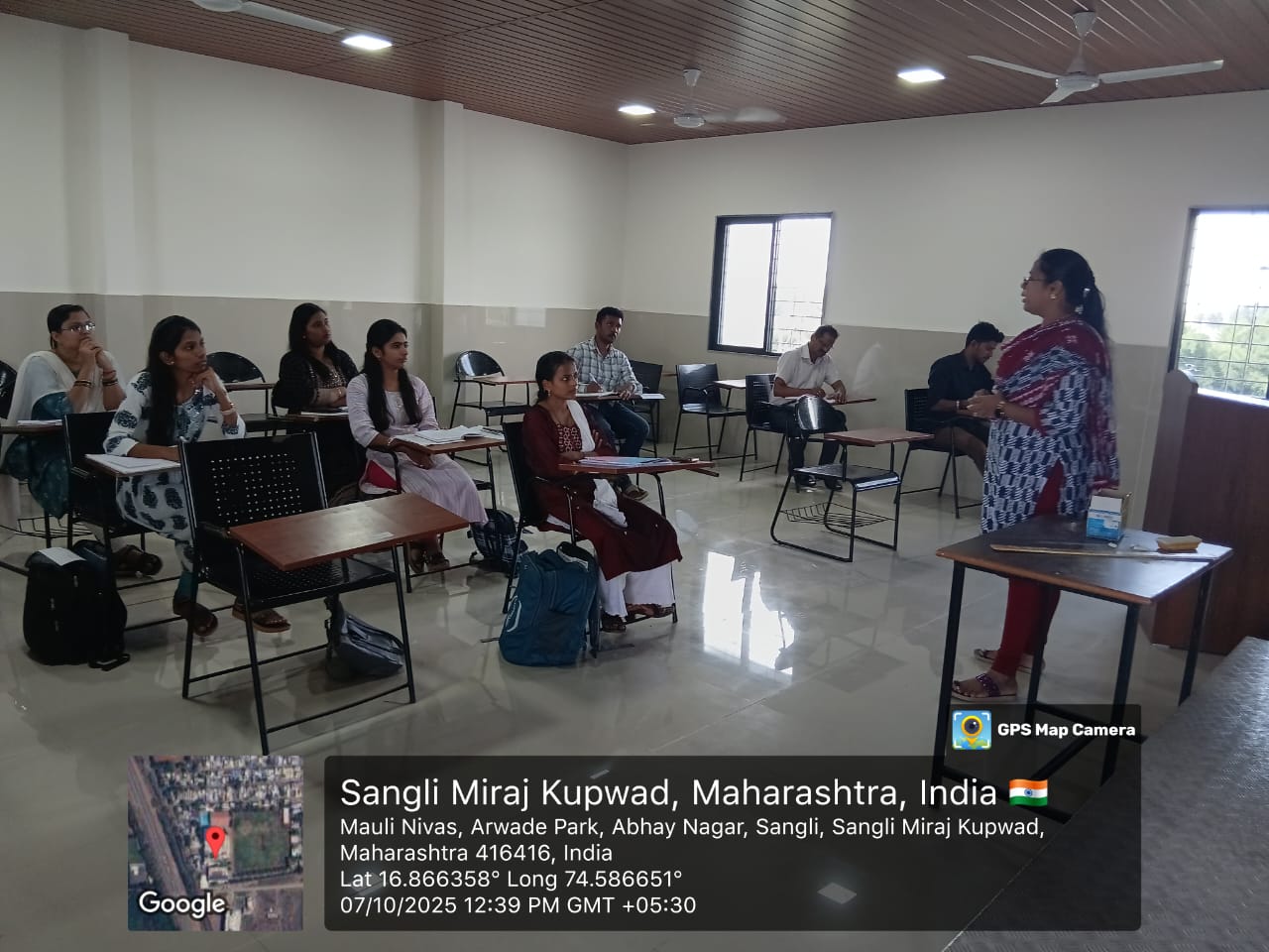 “आप्पासाहेब बिरनाळे कॉलेज ऑफ एज्युकेशन,सांगली येथे एम.एड.अभ्यासक्रम उद्बोधन कार्यशाळा व नवागत स्वागत समारंभ उत्साहात संपन्न” सांगली दि.07/10/2025 आप्पासाहेब बिरनाळे कॉलेज ऑफ एज्युकेशन,सांगली येथे एम.एड.सेम एक अभ्यासक्रम उद्बोधन कार्यशाळा व स्वागत समारंभाचे आयोजन करण्यात आले होते.एम.एड.चे सहा.प्रा. श्री.चांदणे एस.व्ही.सहा. प्रा. पाटोळे व्ही.एन. सहा. प्रा. होनमाने पी.पी.सहा. प्रा. माने एस. जी.यांनी वेळापत्रकानुसार संपूर्ण दिवसभर एम.एड.सेमिस्टर एक मधील अभ्यासक्रमाची सर्व पेपर्स चे उद्बोधन केले यामध्ये वेळापत्रकानुसार 11.30 ते 5.00 या वेळेत अनुक्रमे 1) सहा.प्रा.चांदणे एस. व्ही. – “Philosophy of Education “2) सहा. प्रा. पाटोळे व्ही. एन.-“Psychology of learner and Learning” 3) सहा.प्रा. माने एस.जी.” Basics of Educational Research” 4) सहा.प्रा. होनमाने पी.पी. “Educational Guidance and Counselling ” या पेपर्स चे Syllabus Orientation अतिशय उत्कृष्ट पद्धतीने घेतले.त्यानंतर प्रशिक्षणार्थीचा स्वागत समारंभ आयोजित करण्यात आला.यामध्ये प्रास्ताविक व स्वागत प्रा.पाटोळे व्ही.एन.यांनी केले.त्यानंतर कार्यक्रमाच्या अध्यक्षा उप-प्राचार्या डॉ.दिपा बिरनाळे यांनी आपल्या अध्यक्षीय मनोगतात सुरुवातीस सर्व नवागत प्रशिक्षणार्थी चे स्वागत केले व महाविद्यालयातील भौतिक सुविधा,ग्रंथालय सदैव आपल्यासाठी खुले राहील,तसेच परिपूर्ण माहिती साठी या सर्व शैक्षणिक विभागाचे सर्व प्राध्यापक आपणास सदैव उपलब्ध असतील .आपल्यास लागेल ती शैक्षणिक मदत आपणास देण्यास आम्ही तत्पर आहोत.असे सांगितले.त्यानंतर ऑफिस क्लार्क श्री .कौतुक काटकर यांनी पात्रतेसाठी लागणारी कागदपत्रे याबद्दल सूचना दिल्या.त्यानंतर शेवटी प्रा .श्री.चांदणे एस. व्ही.यांनी सर्वांचे धन्यवाद व आभार मानले. यावेळी बहुसंख्य एम.एड. प्रशिक्षणार्थी उपस्थित होते.